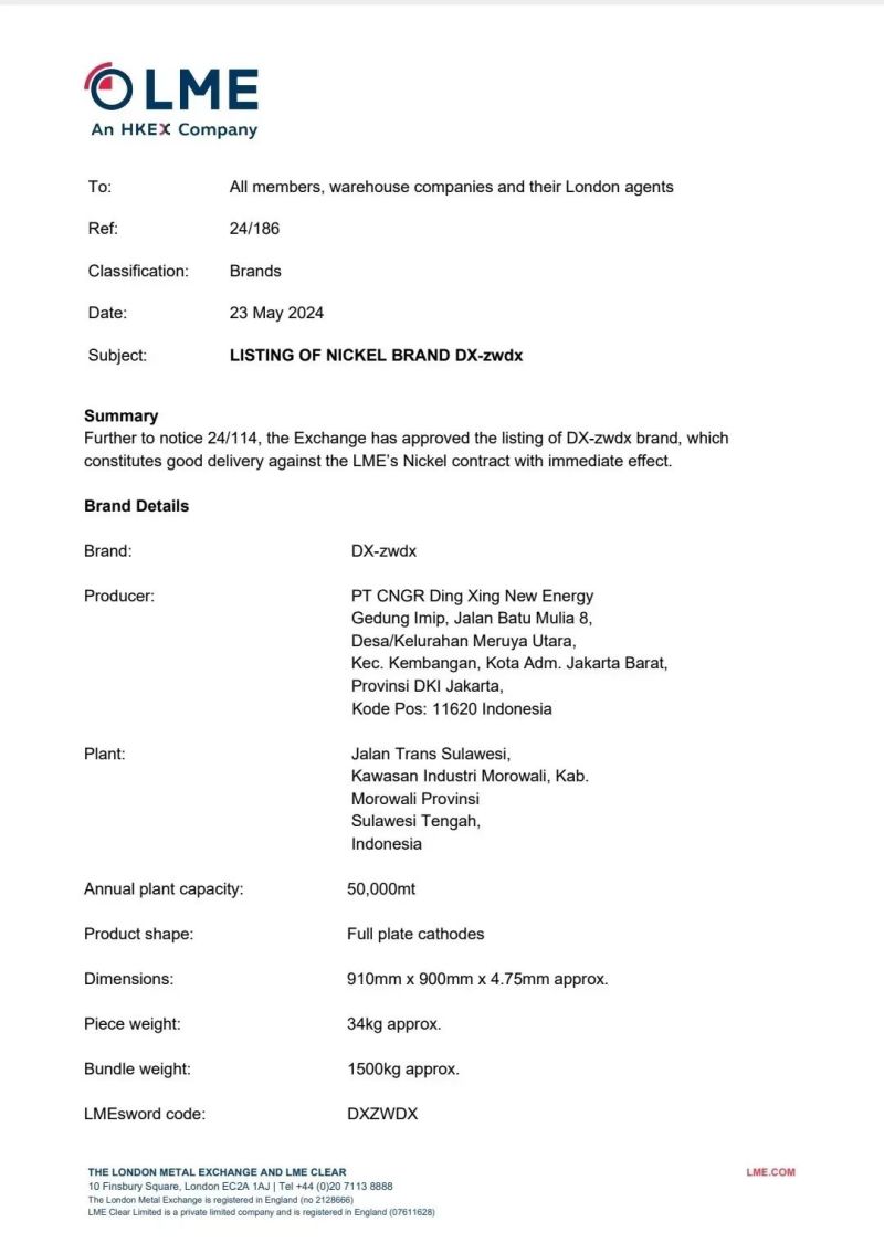 2024年5月23日,全球最大的有色金屬交易中心-倫敦金屬交易所(簡(jiǎn)稱“LME”)發(fā)布公告,印尼中偉鼎興新能源有限公司生產(chǎn)的“DX-zwdx”牌電解鎳獲得LME的認(rèn)證注冊(cè),正式成為L(zhǎng)ME鎳交割品牌,標(biāo)志著印尼生產(chǎn)的純鎳獲得“全球通行證”,這是東南亞首個(gè)LME鎳交割品牌,增強(qiáng)了印尼鎳產(chǎn)業(yè)在全球的影響力,對(duì)整個(gè)東南亞、印尼的鎳產(chǎn)業(yè)發(fā)展具有重要意義。